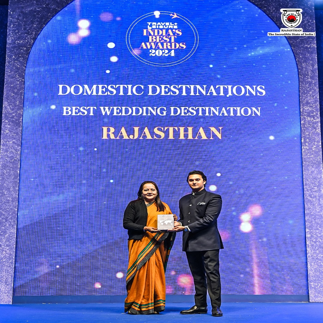 Rajasthan has been crowned the “Best Wedding Destination” at the Travel+ Leisure’s Best India Award 2024" From luxurious palaces to tranquil deserts, every corner tells a story of luxury and majesty. Rajasthan continues to capture the hearts of couples worldwide for destination weddings. Ms. Sumita Saroch (Joint. Director) received this prestigious honor at the event held in ITC Maurya, Delhi, a testament to the beauty, hospitality, and unmatched experiences Rajasthan offers.